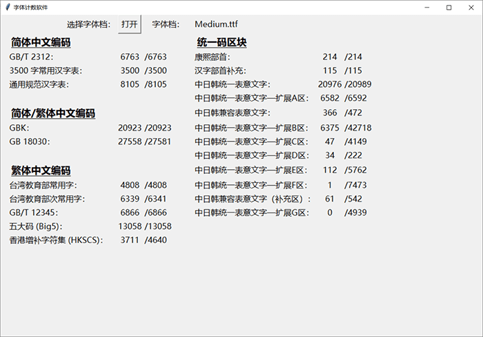 下面这个图统计了这款字体里面包含多少个简体字数和繁体字数等信息,方便大家直观地了解这款字体的简繁字体数量。中国大陆的小伙伴只需特别关注GB2312和3500字常用汉字表的数量就可以了。