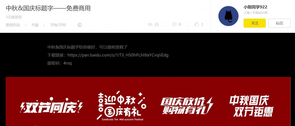 今年的中秋节和国庆节是在同一天,亲爱的@小刚同学922已经把中秋&国庆标题字给你做好,各位亲爱的设计师小伙伴们可以提前放假了!祝大家中秋国庆快乐,再见!