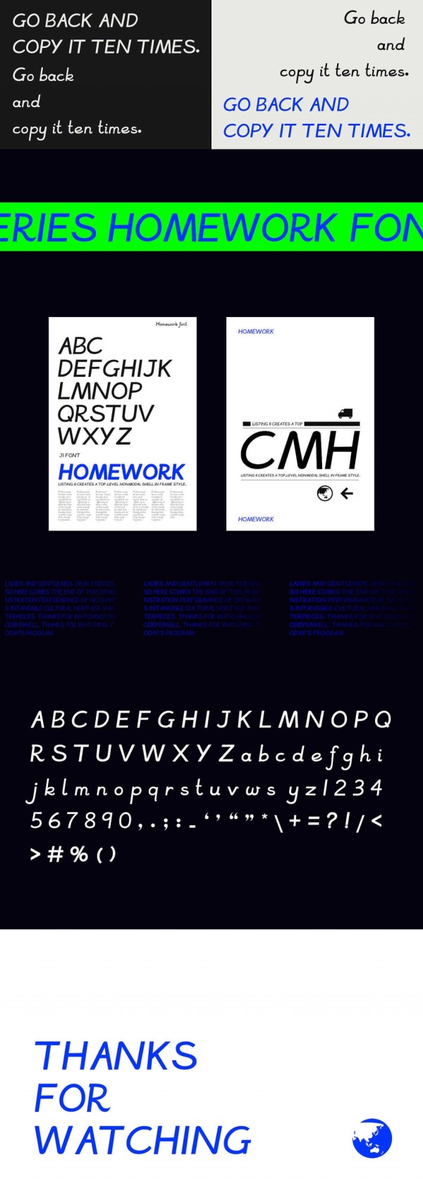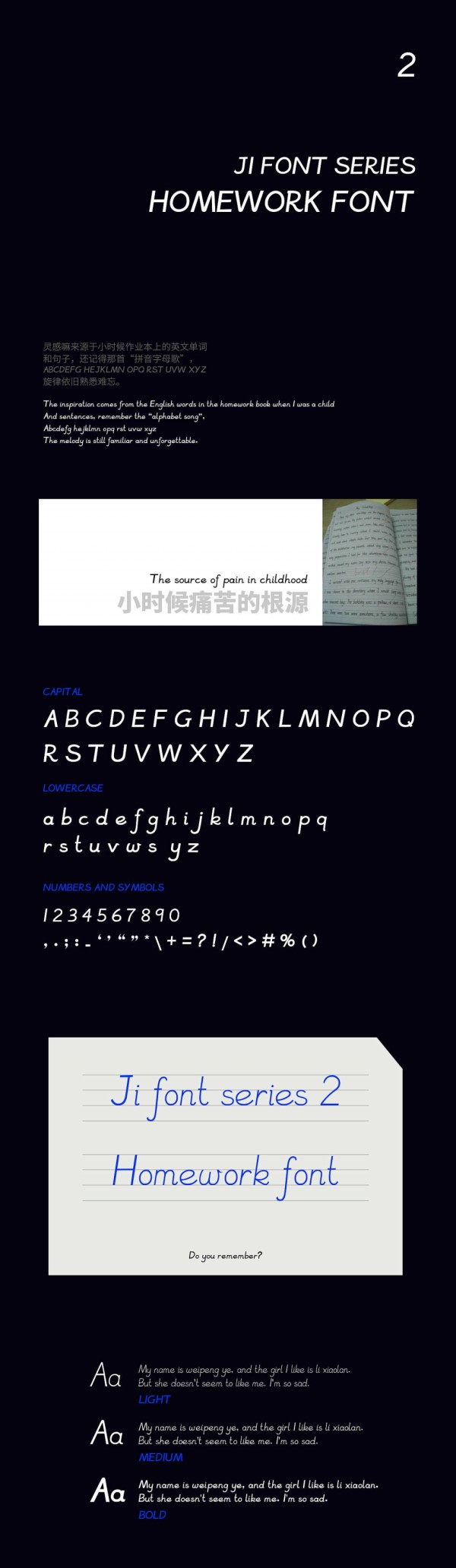 我在做完字体framework后,身边不少朋友嫌弃使用场景太少,不实用(小声哔哔:那是你不会用,hhh);我怎么能忍受这种不负责的话呢,所以我不仅改良了framework还又做了一套字体homework,灵感嘛来源于小时候作业本上的英文单词和句子,还记得那首“拼音字母歌”,“abcdefg hejklmn opq rst uvw xyz”旋律依旧熟悉难忘。
