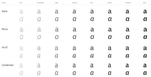 IBM Plex Family 由三大字体类型组成:Sans-serif(无衬线体)、Serif(衬线体)和 Mono(等宽字体),相信熟悉英文字型的朋友对于这三种字体类型一定不陌生,每种类别有八种不同的字重:Thin、ExtraLight、Light、Text、Regular、Medium、Bold、SemiBold,也有为斜体设计的 Italic 系列。