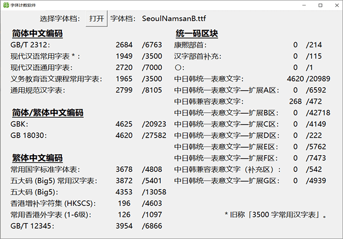 下面这个图统计了这款字体里面包含多少个简体字数和繁体字数等信息,方便大家直观地了解这款字体的简繁字体数量。中国大陆的小伙伴只需特别关注GB2312和3500字常用汉字表的数量就可以了。这个统计软件是来自马来西亚的网友“夜煞之乐”编写提供给猫啃网使用,十分感谢他的分享!如果您想下载这款字体统计软件,可以在GitHub或者码云进入该软件的开源项目进行下载。