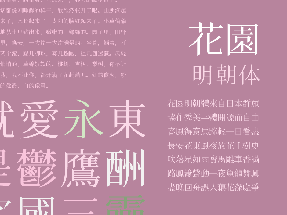 花園フォント(花园明朝, 花园宋体,Hanazono Mincho,HanaMin)是一款基于日语的自由开源汉字字体,也是 GlyphWiki Project 的一部分。这款字体的特点是涵盖了目前 CJK (中日韩统一表意文字)字库中几乎所有的汉字与字符, 而且作为开源项目,任何人可自由下载使用。