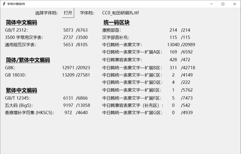下面这个图统计了这款字体里面包含多少个简体字数和繁体字数等信息,方便大家直观地了解这款字体的简繁字体数量。中国大陆的小伙伴只需特别关注GB2312和3500字常用汉字表的数量就可以了。这个统计软件是来自马来西亚的网友“夜煞之乐”编写提供给猫啃网使用,十分感谢他的分享!如果您想下载这款字体统计软件,可以在GitHub或者码云进入该软件的开源项目进行下载。