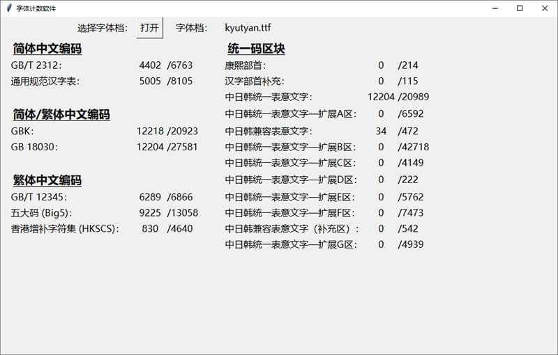 这款字体是日本的设计师发布的字体,所以字符是以JIS水准为标准的,所以对繁体支持较好,对简体支持较差。下面这个图统计了这款字体里面包含多少个简体字数和繁体字数等信息,方便大家直观地了解这款字体的简繁字体数量。这个统计软件是来自马来西亚的网友“夜煞之乐”编写提供给猫啃网使用,十分感谢她的分享!