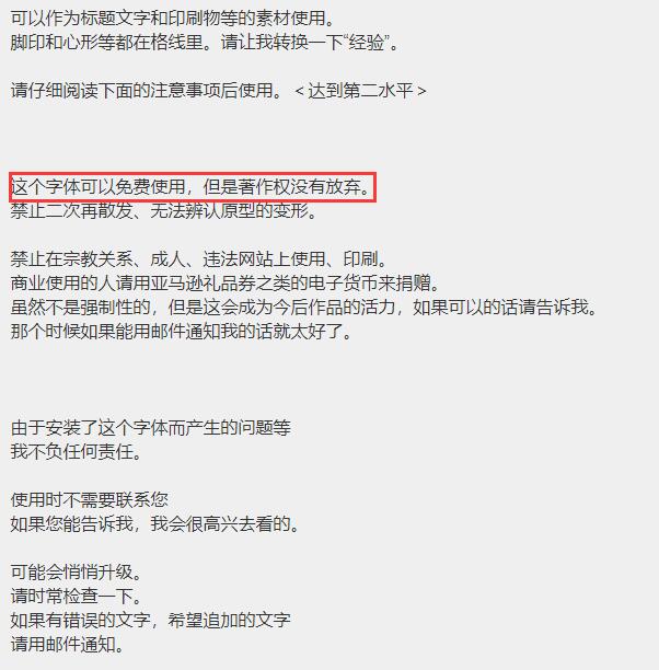 这款字体可以免费商用!由于这款字体年代比较久远,作者似乎在2010年之后也没有再维护这款字体,所以作者提供的网站已经打不开了。但是,在字体的文件包里有字体的授权说明文件,授权说明文件上有介绍这款字体可以免费商用,大家请放心下载使用。(PS:授权说明文件是日文的,大家可以百度翻译一下)