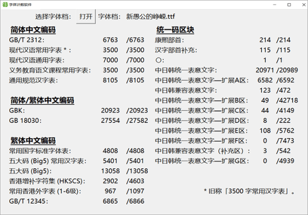下面这个图统计了这款字体里面包含多少个简体字数和繁体字数等信息,方便大家直观地了解这款字体的简繁字体数量。中国大陆的小伙伴只需特别关注GB2312和3500字常用汉字表的数量就可以了。这个统计软件是来自马来西亚的网友“夜煞之乐”编写提供给猫啃网使用,十分感谢他的分享!如果您想下载这款字体统计软件,可以在GitHub或者码云进入该软件的开源项目进行下载。