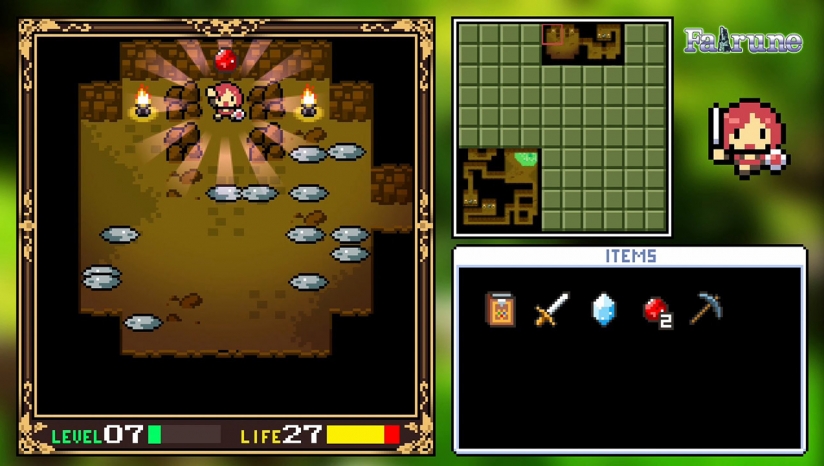 选择界面中排在第一的游戏,相对于Fairune Origin本作内容丰富了不少,不仅有了作为解说的起始之书,并且有了等级和战斗的概念。游戏中只需触碰敌人就会进行战斗,当遇到势均力敌的敌人时,可以获得经验值但同时也会受到固定的伤害。