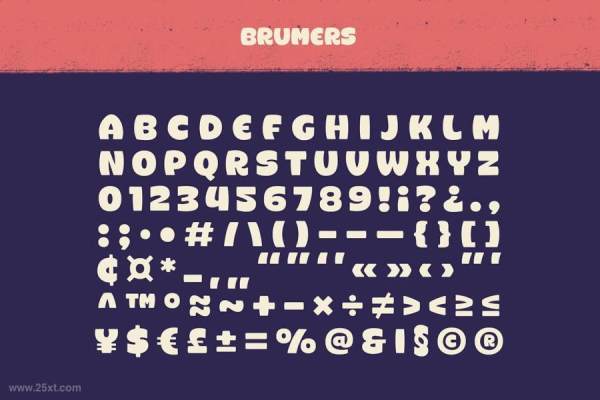 Brumers是一款可爱有趣的装饰性英文无衬线字体,包括大小写字母、0-9十个数字和多种标点符号。字体提供3种样式:常规字体、圆润字体、毛刺边缘字体,每种样式字体都提供给斜体字。略微倾斜的粗体字形和圆润的笔划显得整体具有可爱创意风格,字形包括连体这种变体,支持多语言,非常适用于品牌徽标、创意海报、T恤服饰等设计项目中。