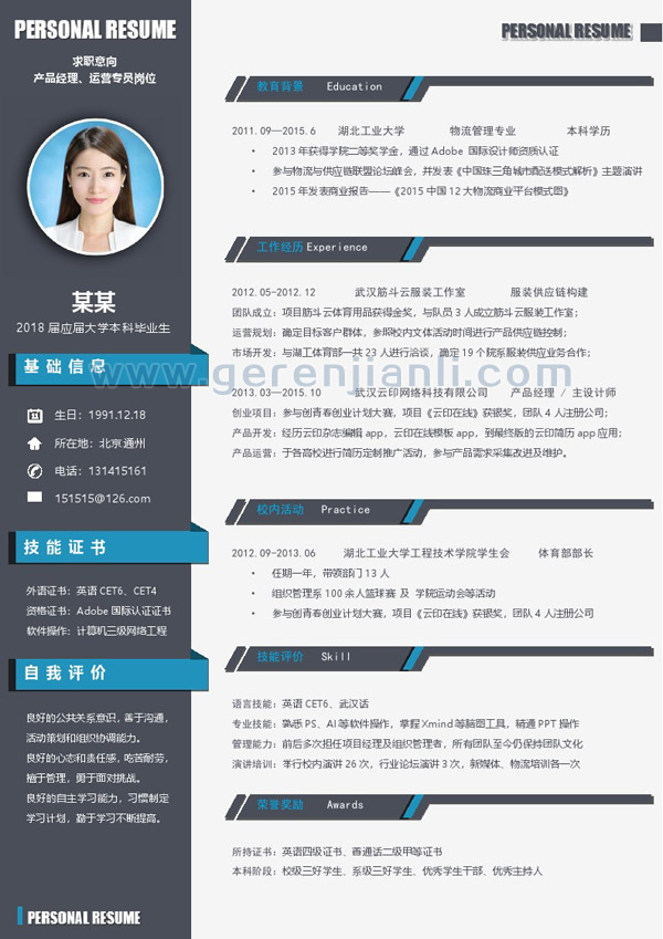 简历为word形式,适合应届毕业生在校招中求职产品经理岗位使用。