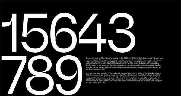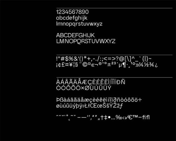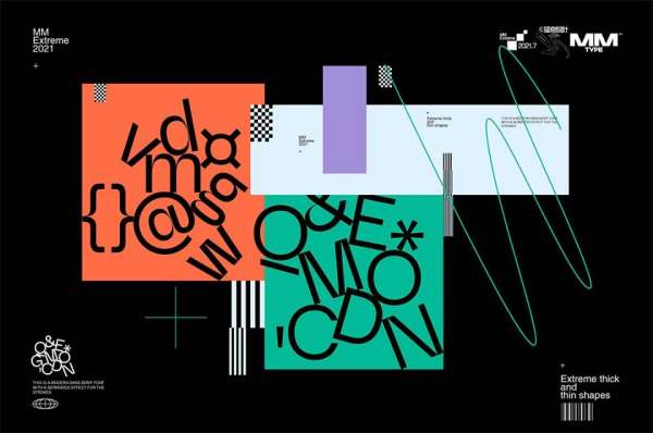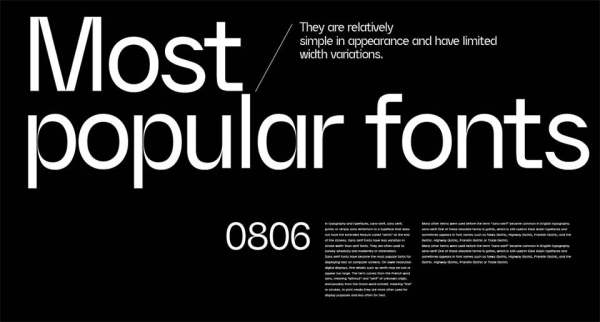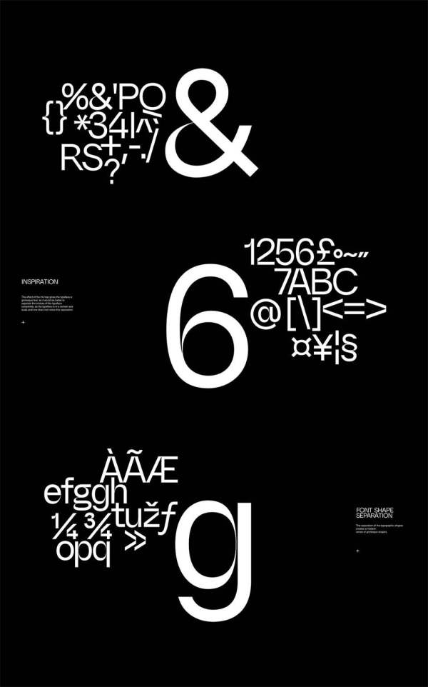 这是一款现代无衬线字体,采用扁平的形式和笔画分离的处理方式。大段文字的编排效果良好,用作大标题时则有锋利而夸张的笔触形态。
