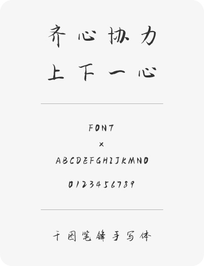 字体介绍千图笔锋手写体定义为一款清新的创意手写字体。在字形笔画上改变了平直的笔画,用柔和的弧线将字体的柔美发挥的淋漓尽致,字形新颖独特,简洁有力,清新淡雅,文艺范十足。整体采用连笔写法,一气呵成,更显流畅。适用于海报 、影视综艺、文艺宣传等场景。字体样式
