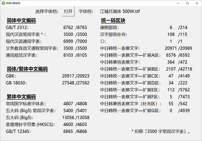 下面这个图统计了这款字体里面包含多少个简体字数和繁体字数等信息,方便大家直观地了解这款字体的简繁字体数量。中国大陆的小伙伴只需特别关注GB2312和3500字常用汉字表的数量就可以了。这个统计软件是来自马来西亚的网友“夜煞之乐”编写提供给猫啃网使用,十分感谢他的分享!如果您想下载这款字体统计软件,可以在GitHub或者码云进入该软件的开源项目进行下载。