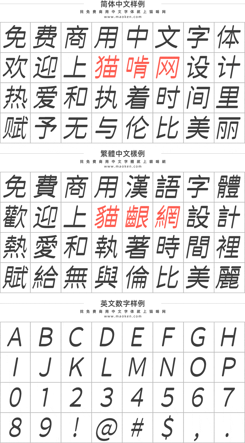 这款字体字形灵秀清美,横粗竖细的风格颇为特别,圆润的笔画中又带着一点动感,比较适合用作正文,标题,偏柔美风格的设计。刘鹏大神已经在猫啃网上发布了江城知音体、江城斜黑体、江城斜宋体、江城正义体、江城圆体等多款免费商用字体供广大设计师使用,猫啃君在这里再次对刘鹏大神表示感谢!