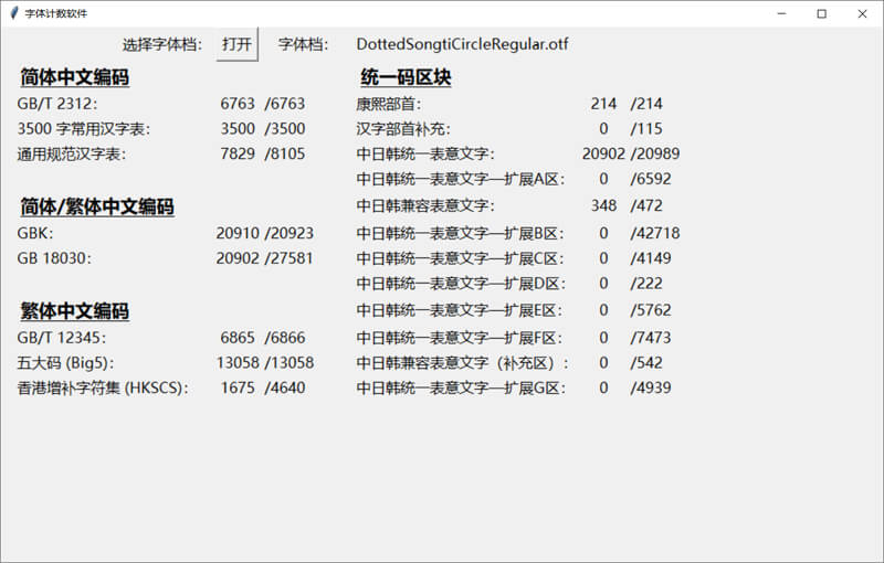 下面这个图统计了这款字体里面包含多少个简体字数和繁体字数等信息,方便大家直观地了解这款字体的简繁字体数量。中国大陆的小伙伴只需特别关注GB2312和3500字常用汉字表的数量就可以了。这个统计软件是来自马来西亚的网友“夜煞之乐”编写提供给猫啃网使用,十分感谢她的分享!