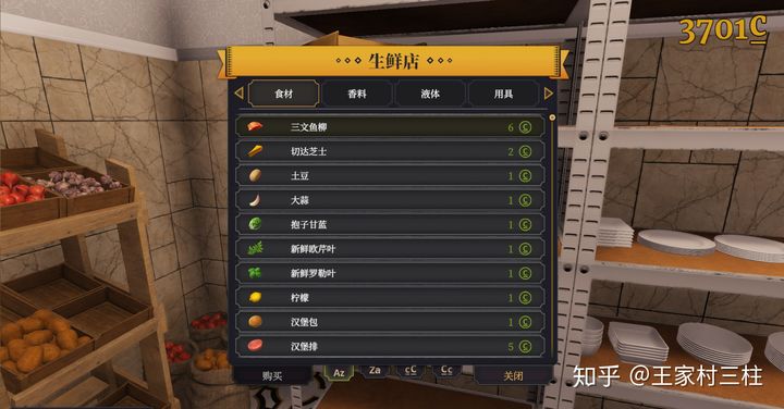 厨房没有的东西需要通过商店购买,旁边有各式各样的碟子,也是需要购买的