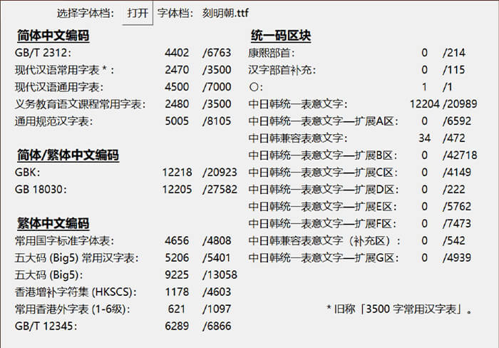 下面这个图统计了这款字体里面包含多少个简体字数和繁体字数等信息,方便大家直观地了解这款字体的简繁字体数量。中国大陆的小伙伴只需特别关注GB2312和3500字常用汉字表的数量就可以了。这个统计软件是来自马来西亚的网友“夜煞之乐”编写提供给猫啃网使用,十分感谢他的分享!如果您想下载这款字体统计软件,可以在GitHub或者码云进入该软件的开源项目进行下载。
