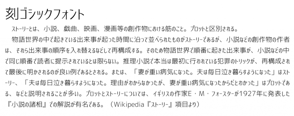 刻黑体是一种结合了标准黑体字体与相矛盾的小平假名和片假名字符的字体。 与传统的平假名和片假名相比,线性形状是一个特征。 汉字的设计水平图像比垂直图像略薄。 这表达了一种轻盈而有节奏的氛围。