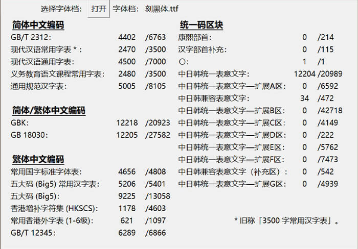下面这个图统计了这款字体里面包含多少个简体字数和繁体字数等信息,方便大家直观地了解这款字体的简繁字体数量。中国大陆的小伙伴只需特别关注GB2312和3500字常用汉字表的数量就可以了。这个统计软件是来自马来西亚的网友“夜煞之乐”编写提供给猫啃网使用,十分感谢他的分享!如果您想下载这款字体统计软件,可以在GitHub或者码云进入该软件的开源项目进行下载。
