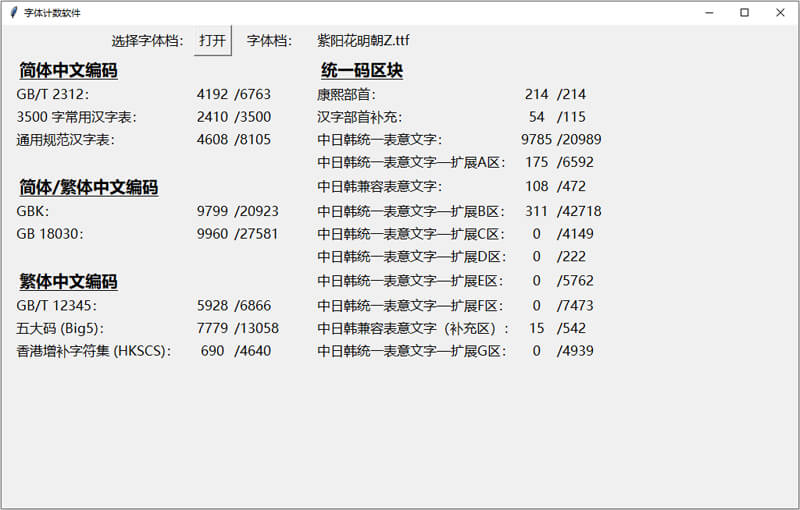 下面这个图统计了这款字体里面包含多少个简体字数和繁体字数等信息,方便大家直观地了解这款字体的简繁字体数量。中国大陆的小伙伴只需特别关注GB2312和3500字常用汉字表的数量就可以了。这个统计软件是来自马来西亚的网友“夜煞之乐”编写提供给猫啃网使用,十分感谢她的分享!