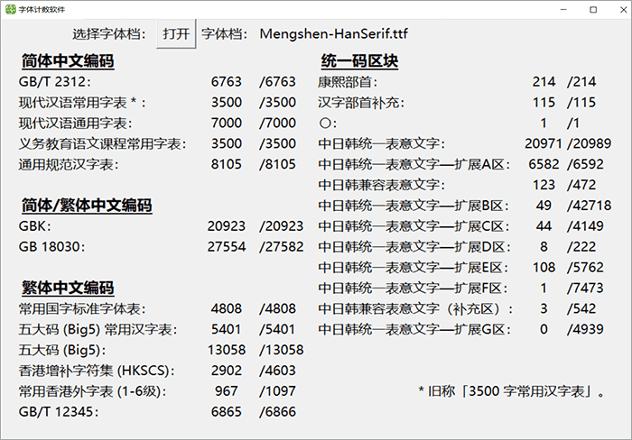 下面这个图统计了这款字体里面包含多少个简体字数和繁体字数等信息,方便大家直观地了解这款字体的简繁字体数量。中国大陆的小伙伴只需特别关注GB2312和3500字常用汉字表的数量就可以了。这个统计软件是来自马来西亚的网友“夜煞之乐”编写提供给猫啃网使用,十分感谢他的分享!如果您想下载这款字体统计软件,可以在GitHub或者码云进入该软件的开源项目进行下载。