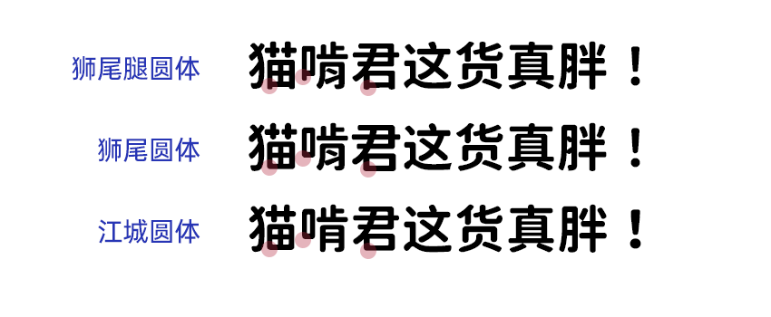 狮尾腿圆体和狮尾圆体差别在有没有拔脚。狮尾圆体是“有拔脚”的,字会较圆,但是会造成有些字因直接去掉腿后左右不平衡、左右不对衬的“悬空”问题。使用“腿”系列就比较不会有失衡的问题,但是看上去还是会有黑体的感觉。