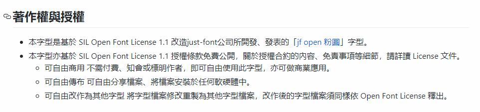 俊羽圆体是基于粉圆字体进行修改的字型,而粉圆字体是基于 SIL Open Font License 1.1 授权条款,不需付费、知会或标明作者,即可自由使用此字型,亦可做商业应用。
