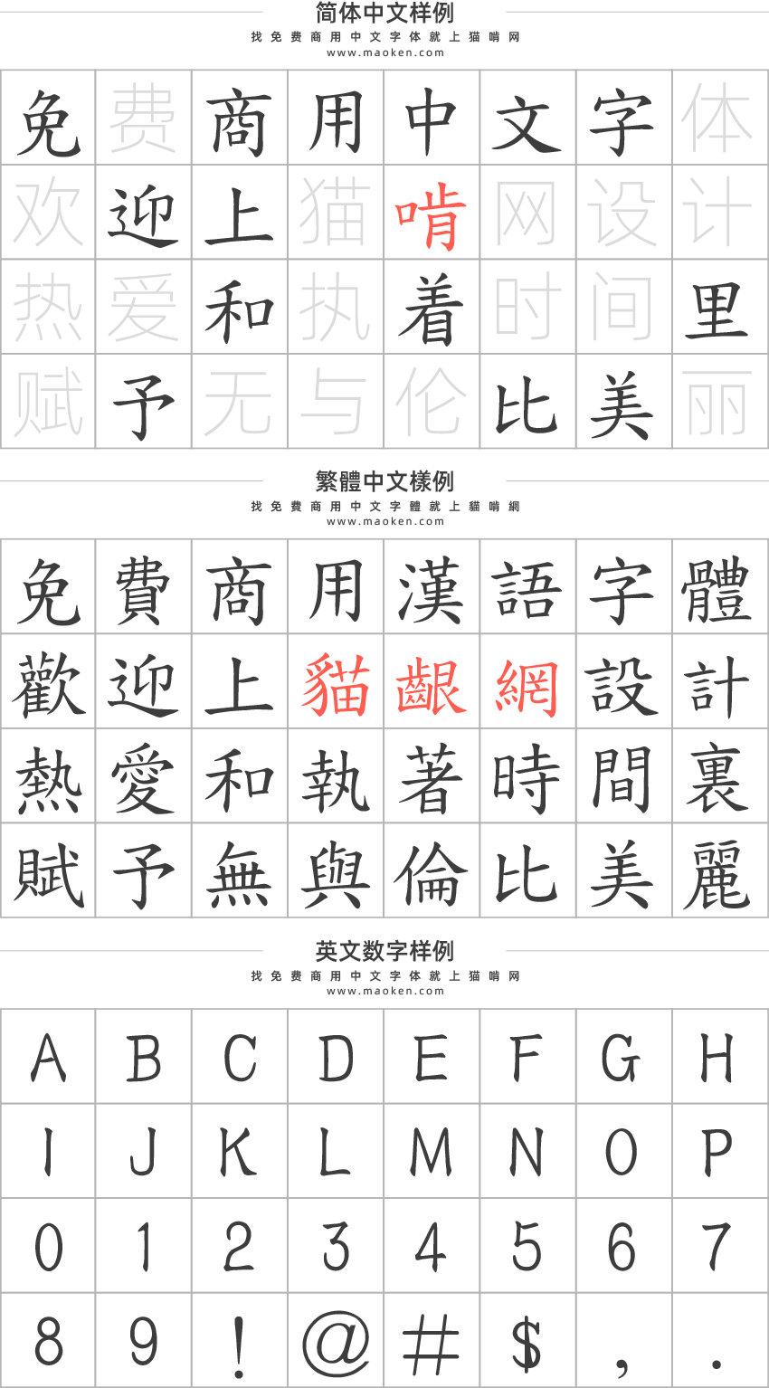本字型为免费香港楷书4700字版,根据《常用字字形表(2007年重排本)》共有4,762个小学生常用字。