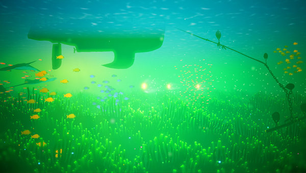 游戏是横版操作,由红色的小海灯引导,走过一个个场景。当场景内的海灯收集完成后,会瞬间点亮场景内的所有珊瑚,让原本有些幽暗的海洋变得色彩斑斓。这一瞬间的变化尤为壮观,让人切实有种要素收集的成就感。