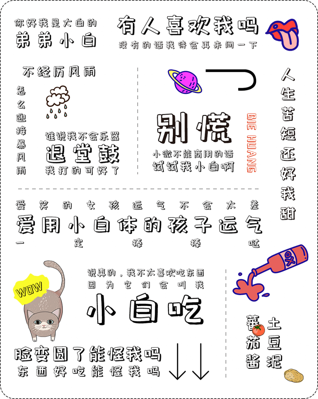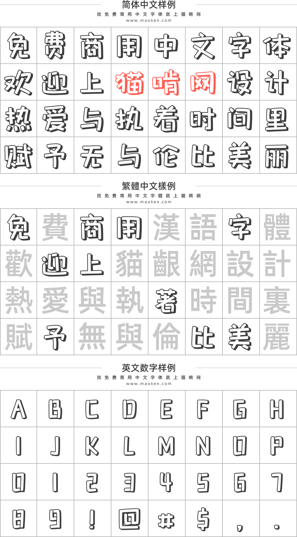 「 包图小白体 」 , 定义为一款简单可爱的创意字体。在字形笔画上去除了折笔的弧形,换之以平直的笔画,竖弯钩转为竖折,同时弱化了钩笔画,省去了许多笔画末尾的小尾巴,显得更加直白可爱。粗短的笔画,像柯基的小短腿,相比细长的字体能给人更多的轻松感。整体形态采用了镂空的制作技巧,增强了字体的立体感,适合用于品牌标志、海报、包装、影视综艺、游戏、漫画等场景。