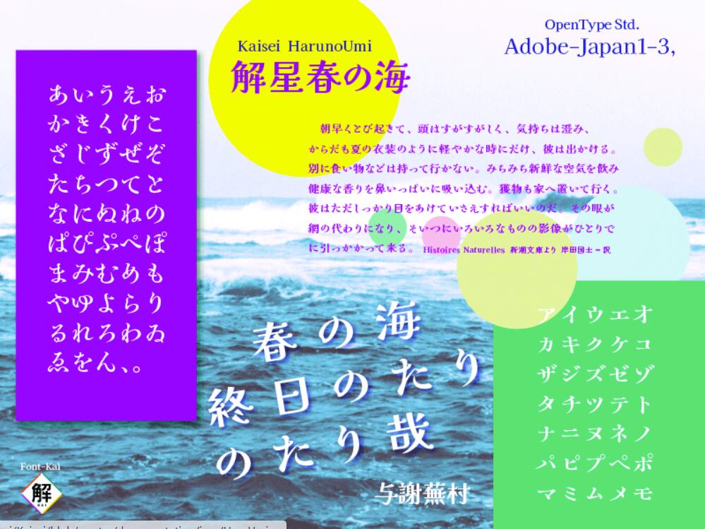 解星 春の海(Kaisei HaruUmi)的假名融入了摇曳的膨胀,用扭动让你感觉更接近你的生活。稍小的Katata具有旧明朝体排版的外观。