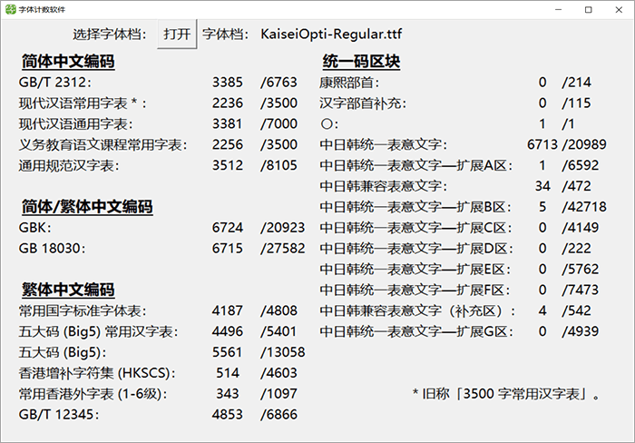 下面这个图统计了这款字体里面包含多少个简体字数和繁体字数等信息,方便大家直观地了解这款字体的简繁字体数量。中国大陆的小伙伴只需特别关注GB2312和3500字常用汉字表的数量就可以了。这个统计软件是来自马来西亚的网友“夜煞之乐”编写提供给猫啃网使用,十分感谢他的分享!如果您想下载这款字体统计软件,可以在GitHub或者码云进入该软件的开源项目进行下载。