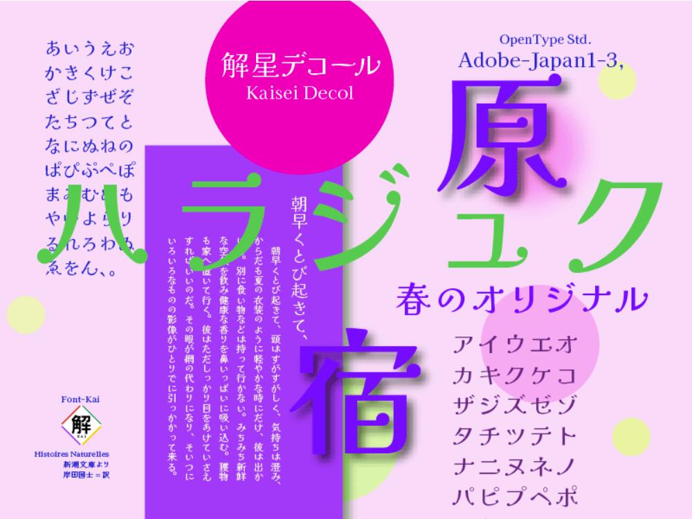 解星デコール(Kaisei Decol)的假名采用汉字元素=星点的统一设计。因为排版上有很多小点,所以会产生可爱、快乐、和谐的表情。主要用短文的标题发挥效果吧。请好好地分开使用。