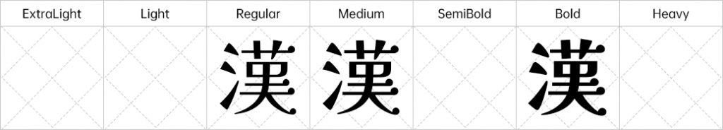 日语字体一般以毛笔楷书的书法为基础。日语字体有汉字(1画~20画~30画线・・・)、平假名・片假名・欧文・符号类,是一个在笔画构成上具有浓度很高的字形集合。这些浓度必须在视觉上调整。