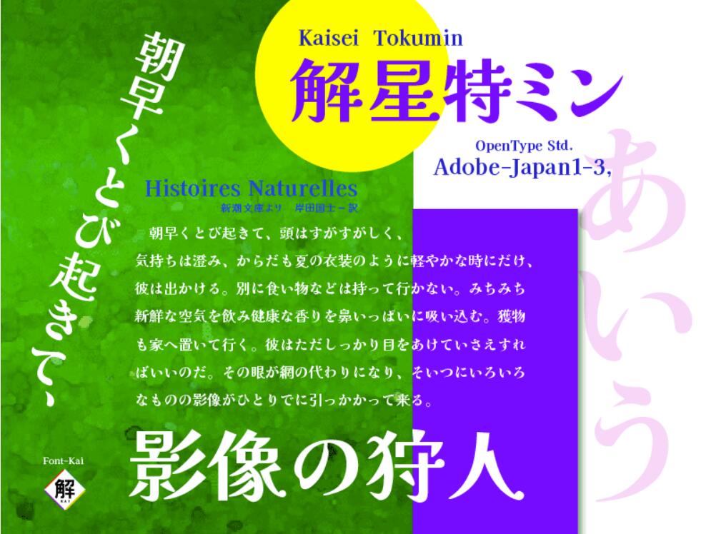 解星 特ミン(Kaisei Tokumin)的假名是特太明朝体假名的省略。这个字体的目的是标题用强有力的假名。当粗字体的密度增加时,字母底部出现不平衡,单词失去呼吸。“Kasei Tokumin 是一种厚字体,旨在即使在一群人中也能保持流畅的可读性,并且不会因强烈的吸引力而失去精致。