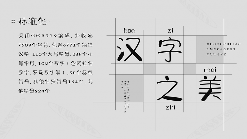 「字体视界法棍体」笔画纤细,规律加粗,曲线折角充分展现它可爱不粗笨的气质。采用GB2312编码,其收容7608个字符,包含6771个简体汉字,110个大写字母、139个小写字母,102个数字(含阿拉伯数字、罗马数字等)、98个标点符号,其它特殊符号164个,其它字母224个。