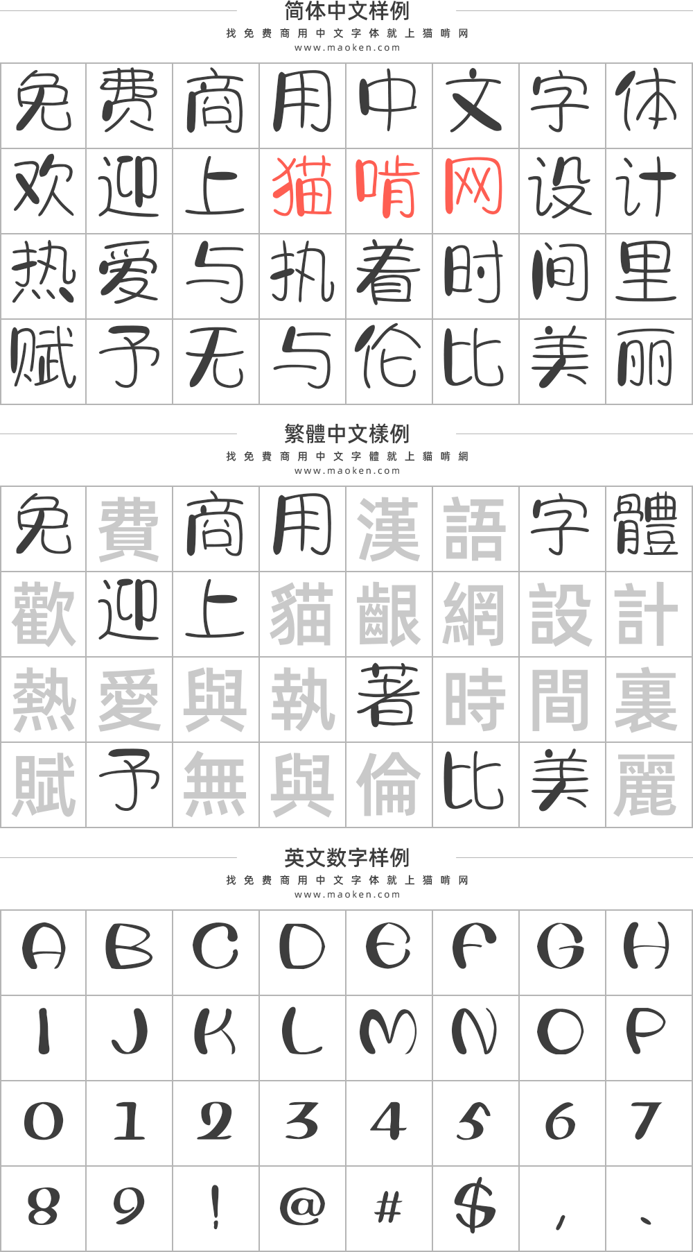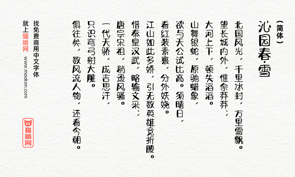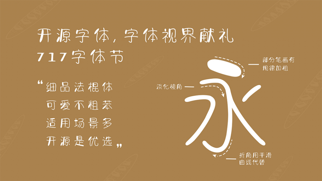 「字体视界法棍体」笔画中间呈弧形外拓,充满张力,加粗字形笔画显得更可爱个性;结构空间变化不像正体那样小,以拙为巧,憨态可掬。这款字体笔画充满张力,结构外圆内疏,左右呼应如手写,各个字生机勃勃又融为一体,整体一气呵成。