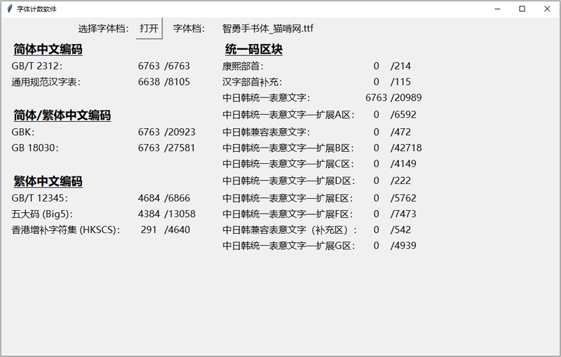 下面这个图统计了这款字体里面包含多少个简体字数和繁体字数等信息,方便大家直观地了解这款字体的简繁字体数量。中国大陆的小伙伴只需特别关注GB2312和3500字常用汉字表的数量就可以了。这个统计软件是来自马来西亚的网友“夜煞之乐”编写提供给猫啃网使用,十分感谢他的分享!如果您想下载这款字体统计软件,可以在GitHub或者码云进入该软件的开源项目进行下载。