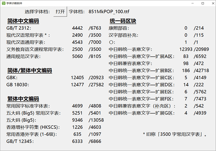 下面这个图统计了这款字体里面包含多少个简体字数和繁体字数等信息,方便大家直观地了解这款字体的简繁字体数量。中国大陆的小伙伴只需特别关注GB2312和3500字常用汉字表的数量就可以了。这个统计软件是来自马来西亚的网友“夜煞之乐”编写提供给猫啃网使用,十分感谢他的分享!如果您想下载这款字体统计软件,可以在GitHub或者码云进入该软件的开源项目进行下载。
