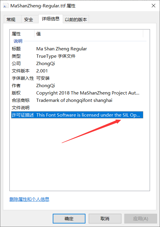 查看字体的文件属性也可以看到,此款字体是SIL Open Font License 1.1授权的。