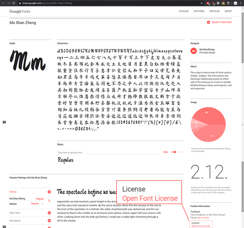 以下是Google Fonts页面上的截图,感谢本站网友“夜煞之乐”提供截图及字体文件。