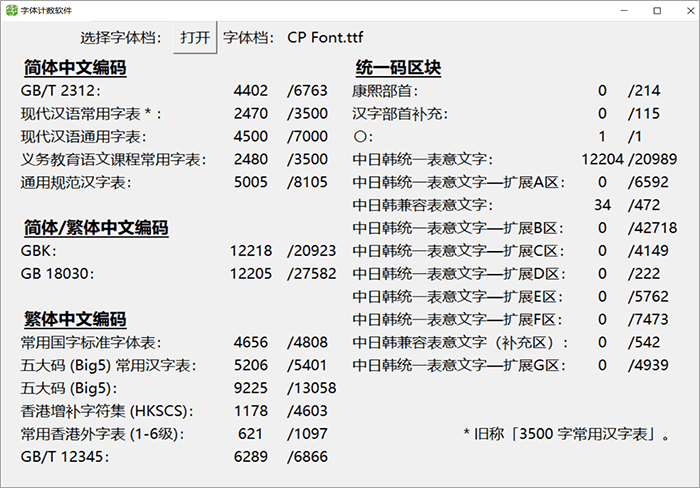 下面这个图统计了这款字体里面包含多少个简体字数和繁体字数等信息,方便大家直观地了解这款字体的简繁字体数量。中国大陆的小伙伴只需特别关注GB2312和3500字常用汉字表的数量就可以了。这个统计软件是来自马来西亚的网友“夜煞之乐”编写提供给猫啃网使用,十分感谢他的分享!如果您想下载这款字体统计软件,可以在GitHub或者码云进入该软件的开源项目进行下载。