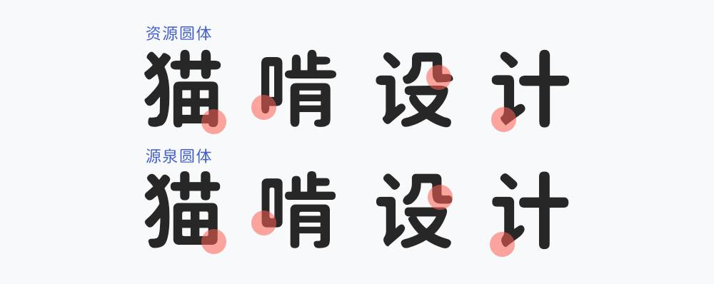 资源圆体与源泉圆体最大的区别就是字体的笔画上有所不同。资源圆体保留着字体的脚,而源泉圆体把字体上的脚都拔除了。