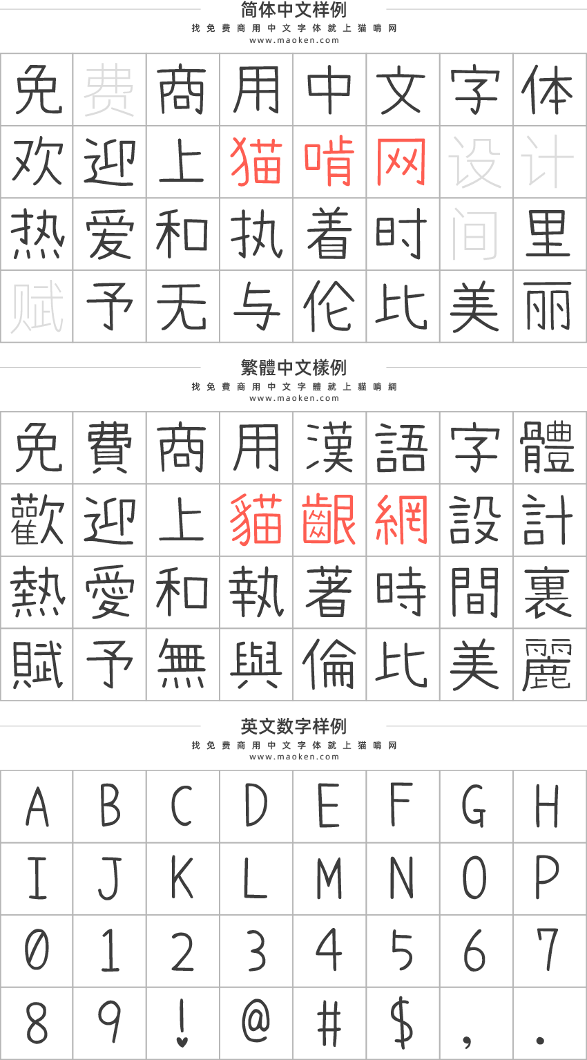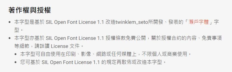 本字型可自由使用在印刷、影像、网路或任何媒体上,不限个人或商业使用。您可基于 SIL Open Font License 1.1 的规定再散佈或改造本字型。