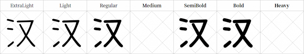 在ExtraLight和Light字重是把原本的濑户字体微微调细一点点。在Light的字重里,可能会因为笔划太细造成某些笔画消失。而在SemiBold和Bold的字重里,可能会因为笔划太粗造成某些笔画重叠难以识别,有粗体字的需求,可以先选择使用Bold字重看看,如果发现效果不如预期,再改用SemiBold字重。
