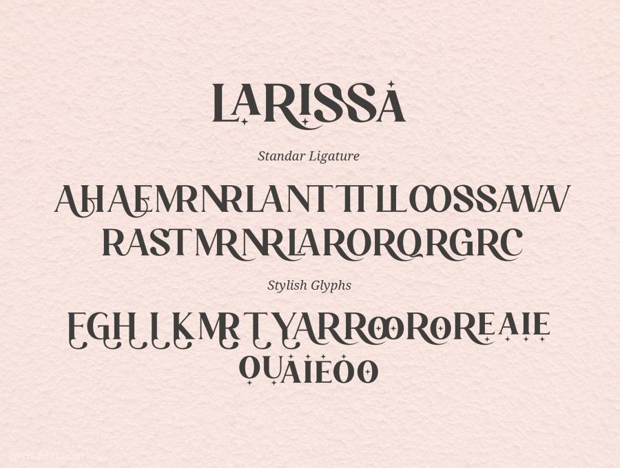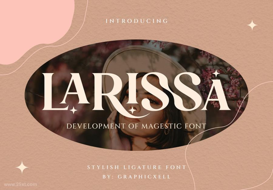 Larissa是一套时尚的英文连字衬线字体,灵感来自著名的极简主义标志,非常适合设计模板、小册子、视频、广告品牌、标志等。包含的内容:Larissa (OTF/TTF)、标准字形、Web 字体、连字。可在 Adobe Illustrator、Adobe Photoshop、Adobe InDesign 中使用,甚至可以在 Microsoft Word 上使用。