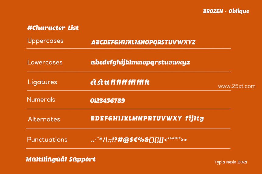 Brozen是一款时尚动感的体育游戏英文无衬线字体,每个字体都融入了动感的曲线,非常适合用于各种标题。例如标志品牌、编辑设计、电子竞技设计、80 年代复古设计、游戏/游戏行业、运动赛车、超级汽车品牌、电子竞技品牌、音乐海报、网站设计、现代广告设计、海报引用、书籍/封面标题、特别活动还有更多。字体提供otf和ttf格式,有常规体和斜体。