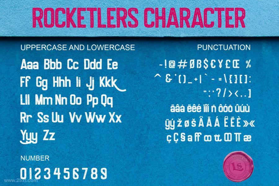 Rocketler 是一套独特复古的手绘装饰性英文字体,灵感来自复古摩托车海报设计,Rocketler 字体包含 199 个字符集,字体设计创意独特。字体提供ttf、otf、woff格式,Rocketler 字体在徽标、标签、产品包装、邀请函、广告等方面都非常好看。