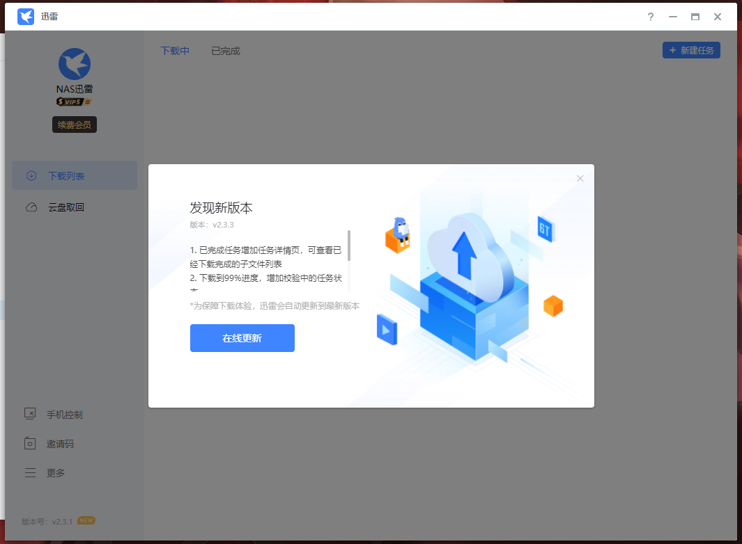 2.3.3版本更新日志: 1. 已完成任务增加任务详情页,可查看已经下载完成的子文件列表 2. 下载到99%进度,增加校验中的任务状态 3. 修复偶发断点续传不生效问题 4. 缩短已完成任务的删除响应时间 5. 修复部分浏览器打开白屏问题 6.修复从云盘取回任务每次都跳转到下载中的问题 7. 修复部分UI问题和已知bug