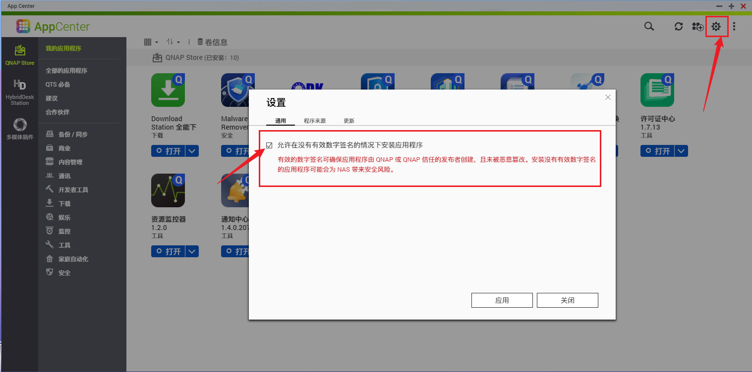 复制这段内容后打开手机迅雷App,查看更方便 安装教程 1. 威联通App center--设置--通用--勾选允许在没有有效数字签名的情况下安装应用程序