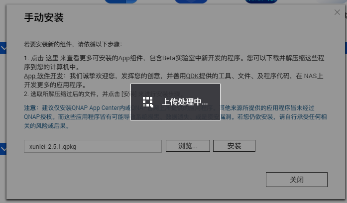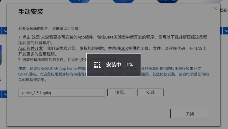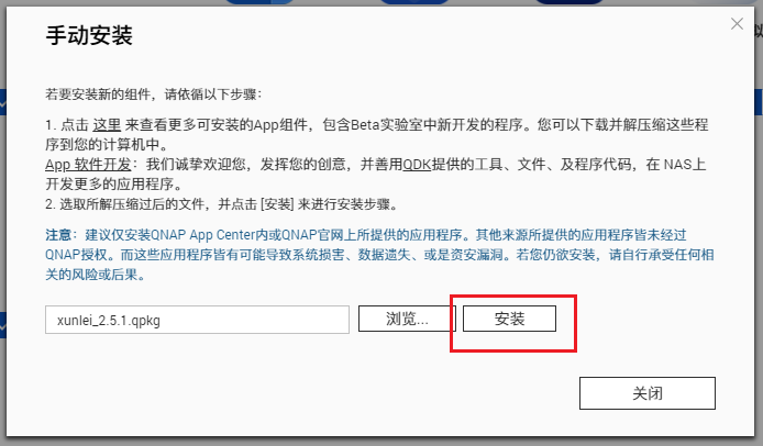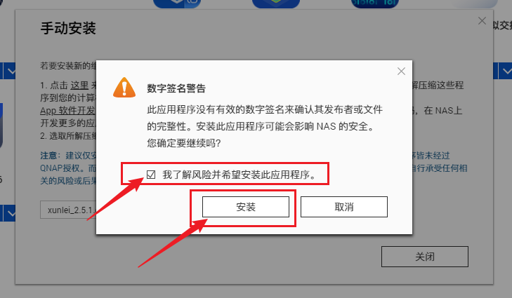 3. 勾选我了解风险并希望安装此应用程序(迅雷正在申请威联通开发者签名,等申请下来就好了)